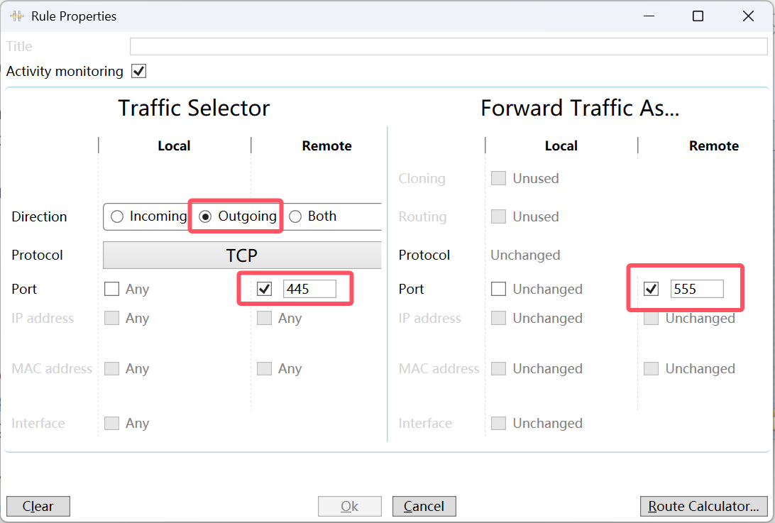 添加规则,Direction选择Outgoing出方向,协议选TCP,Remote的Port写445,在右侧的Remote Port写你需要映射的端口,比如frp映射出的端口是555,这里就填555。