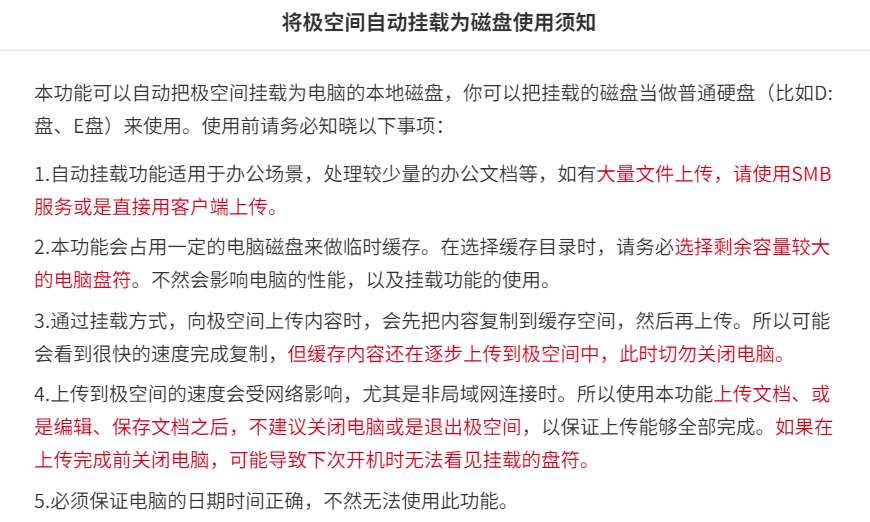 虽然极空间的Windows端也提供了挂载的功能,但是功能很鸡肋,如图,只要是大点的文件直接就废了,它不能做到直接原文件上传,而是非要再复制一份再进行上传。